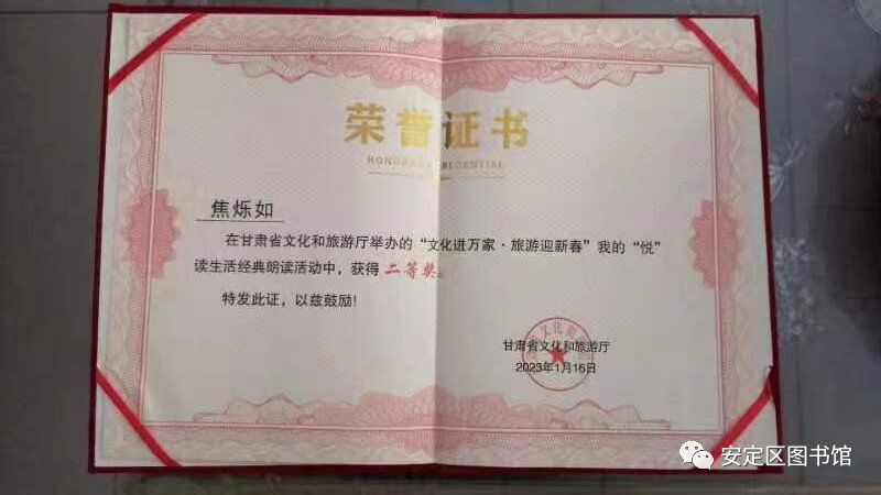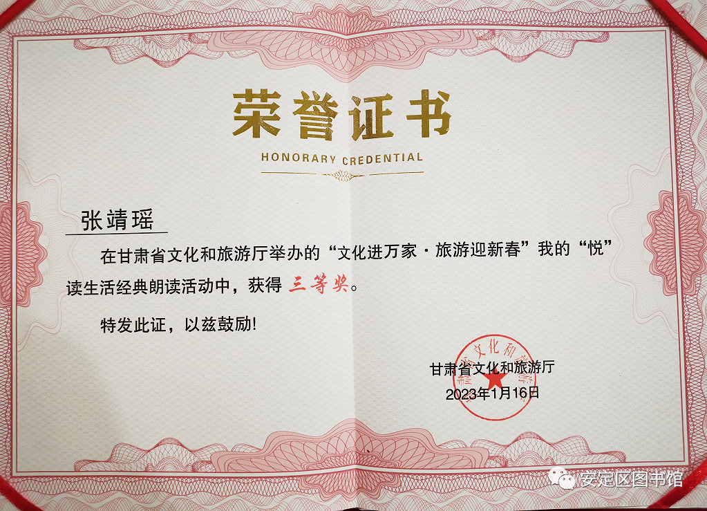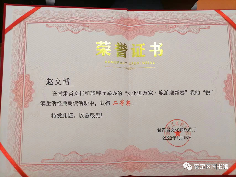 为深入推进全民阅读,建设“书香甘肃”,喜迎兔年新春,1月15日,由甘肃省文旅厅主办,甘肃省图书馆、平凉市文化广电和旅游局、中共静宁县委、静宁县人民政府协办的“文化进万家·旅游迎新春——我的‘悦’读生活”经典朗读活动在平凉市静宁县圆满落幕。 由安定区图书馆推选的七位成人组、少年组和少儿组选手参加了本次经典朗诵竞赛活动,通过激烈角逐,我区代表队少年组焦烁如、赵文博两位荣获二等奖,张靖瑶荣获三等奖,其余四位荣获优秀奖。